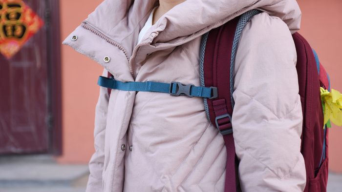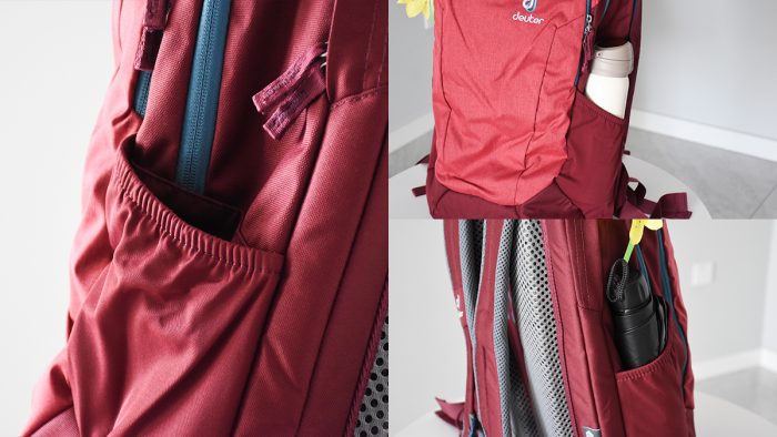 除此之外,在背包的左右两个侧边还分别有一个侧袋,口子的部分有尼龙松紧,对放置的物品起到一定的束缚作用。袋子口的部分也是倾斜的设计,便于放置和取出物品。这里主要用来放水杯和雨伞之类的柱状物件,拿取也比较方便。
