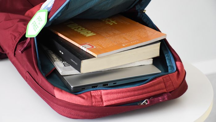 在右侧拉链的位置悬挂有很多个标签,PFC FREE表示背包中不含有全氟化碳物质,这是箱包和服装行业当中为环保做出的贡献,这类物质一旦接触环境便很难分解,残留在环境中会对人体有害,容易致癌或影响荷尔蒙分泌。