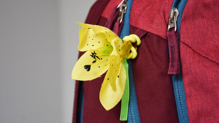 与其他配色不同的是,深红的款式在拉链的位置设计了一朵小黄花,辨识度很强。