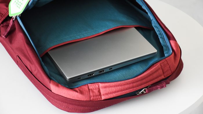 中间一层主仓的容量是最大的,在反面设计了两个储物兜,可以放手机和钱包之类的物件。靠近背部的一侧有一个侧袋,内有衬垫,并且搭配有尼龙松紧收口,主要用户收纳笔记本电脑等尺寸比较大且为扁平形态的物品。根据官方介绍,15英寸的笔记本电脑可以正常放进去,我常用的RedmiBook只有14英寸,更是轻松收纳无压力。