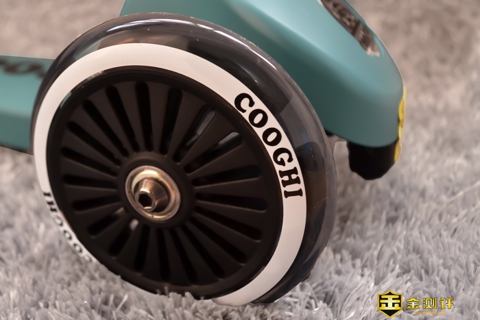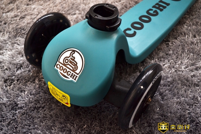 车头部分是COOGHI酷骑V1发光滑板车LOGO。车头黄色贴纸位置是一个防撞击衬垫。