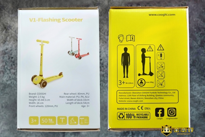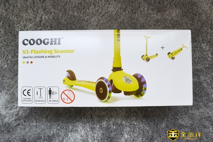 白色的包装盒,黑色COOGHI酷骑家的厂标。明黄的滑板车效果图,别提有多吸引小孩子的目光了。箱子左下角注明了,不建议0-3岁幼童游玩。建议3岁以上身高96-120cm的小朋友使用。车高65-84.5cm。CE的认证标示,这是被视为制造商打开并进入欧洲市场的护照。当然是过硬的质量才有这个喽。