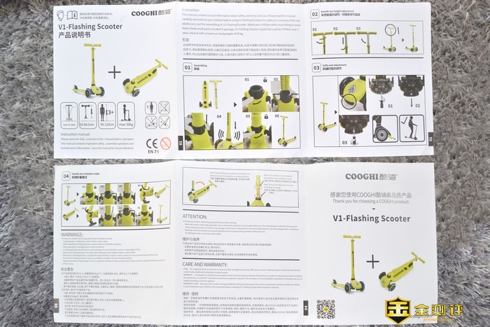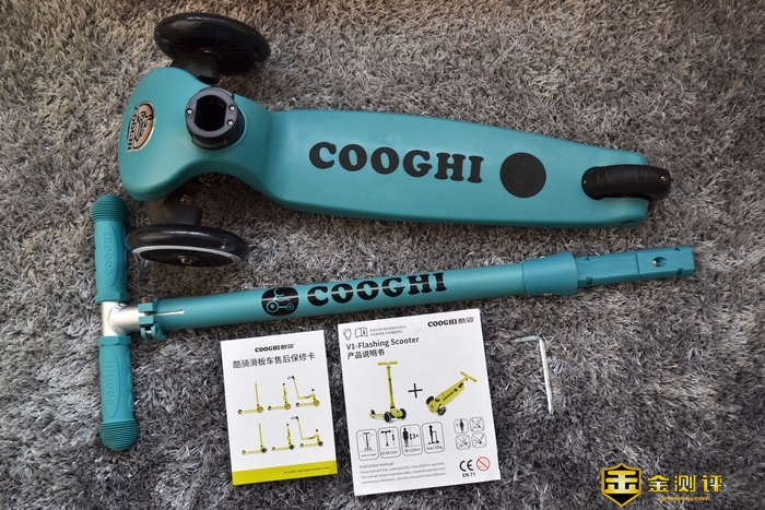 开箱COOGHI酷骑V1发光滑板车,滑板车、可调节握把。一张保修卡,一张产品说明书以及附赠的一把六角螺丝刀的工具,儿童玩具就是这样简单直接。