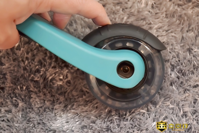 后轮同样设置了LED灯珠,前后轮各安装了三颗单色的LED灯珠,一个红色,一个蓝色, 一个绿色的。小小的挡泥板其实是一个渐进式刹车系统,让孩子可以控制一下自己的滑行速度。