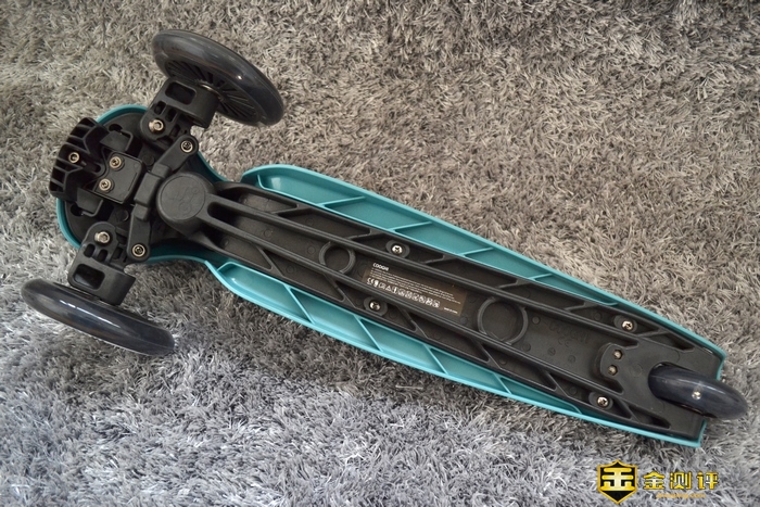 滑板车底部部分,采用加宽加厚的塑料底板制成,建议50公斤一下的孩童游玩。其实我90公斤,站上去也能滑一滑,就是怕给踩坏了。
