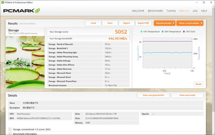最后一项是温度测试,大华C900 PLUS正常工作时的温度大约为40℃左右,与我现在装机使用的金士顿固态(33℃)稍有差别,在刚刚使用PC MARK8进行综合测试的时候,同时对大华C900 PLUS的温度变化做了记录,其主控最高温度可以达到43℃,没有超过官方宣称的NAND的最高温度73℃,同时在整个测试过程中也没有出现温度过高而触发降速现象。