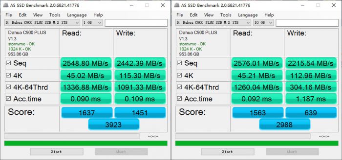 从前面的架构设计解析可知,大华C900 PLUS集成了英韧主控芯片、原厂3D NAND TLC等一系列核心控件,这个配置还是比较令人满意的。接下来主要通过业界比较主流的CrystalDiskInfo、Anvil's Storage Utilities、ATTO Disk Benchmarks、CrystalDiskMark、AS SSD、TxBENCH等工具进行性能测试。