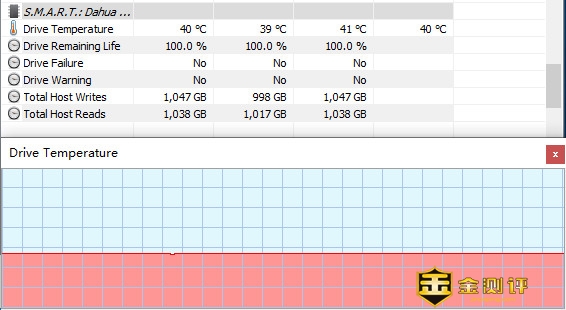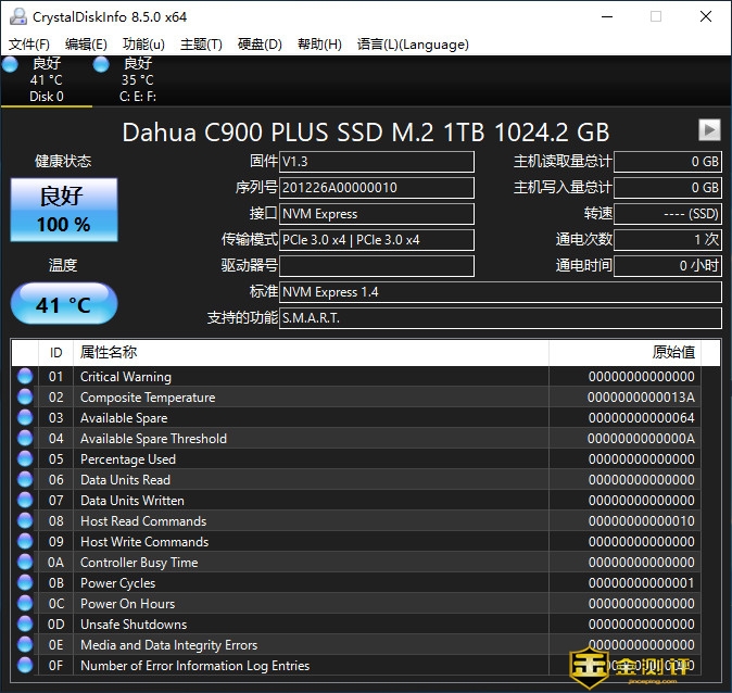 通过CrystalDiskInfo可以查阅到大华C900 PLUS的固件号、序列号、接口协议、支持功能等,待机温度为41℃,硬盘健康状态为100%良好,由此也可以看出大华在品控方面做得非常好。