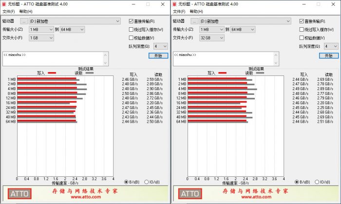 在ATTO Disk Benchmarks(1GB)测试中,大华C900 PLUS固态硬盘的表现也非常稳定,基本上都是写2.42GB/s以上、读2.36GB/s以上。在ATTO Disk Benchmarks(32GB)测试中,写2.44GB/s以上、读2.20GB/s以上。