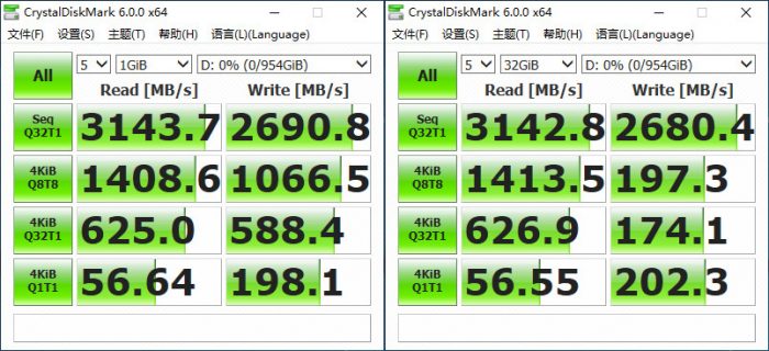在CrystalDiskMark测试中,在1GB文件下,连续读写速度可达3377MB/s2979MB/s,4K随机读写可达1420MB/s、1138MB/s。当使用32GB文件时,顺序读写速度为3142.8MB/s、2680.4MB/s,4K读写速度为1413.5MB/s、197.3MB/s。