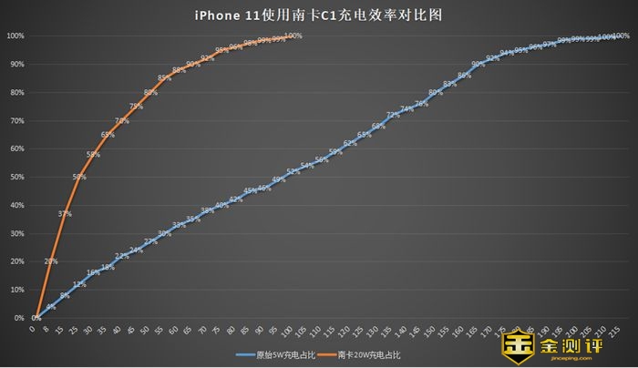 可以看出,在多个机型测试过程中,支持PD充电协议的机型大都可以实现18W快速充电,部分机型受限于私有协议,能维持在15W左右;通过对比iPhone11在默认5W充电器和C1快充上的充电效果,从0%到充满大约耗时100分钟,满满的18W效果丝毫没有放水,比5W充电时间缩短一半以上,足以应对PD协议手机的日常补充续航了。