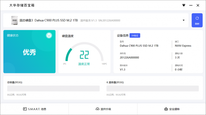 另外,我们还可以在大华的官网下载《大华存储百宝箱》这款应用,从中我们可以了解到很多硬盘的状态信息,后面也能够用来给硬盘升级固件,获得更好的稳定性。