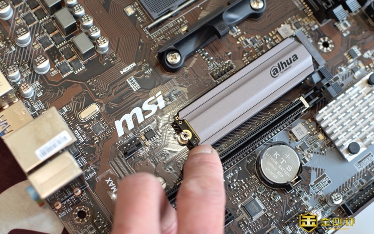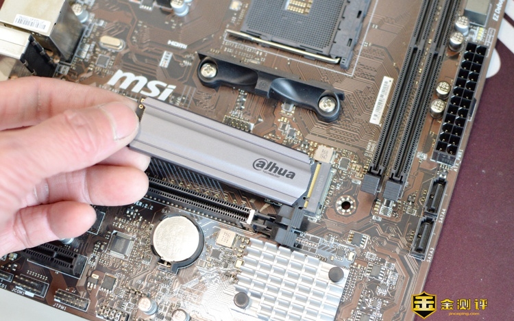 其实安装方面很简单,我们首先把这款固态硬盘的散热胶和散热器罩装好,然后就像安装内存条一样,把硬盘插头对准主板上的M.2插槽,按下去就可以了