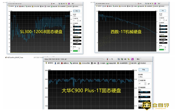 使用HD Tune软件对三块硬盘(SL300固态硬盘+WD机械硬盘+大华C900 PLUS固态)分别进行测试,这三款硬盘平均的读取速度分别为345.8MB/S+145.4MB/S+3114.3MB/S,大华这款固态硬盘的速度相当于SL300固态硬盘的将近9倍,相当于WD机械硬盘的21倍还多;另外不看数据,就看这速率曲线:SL300的浮动范围过大,WD机械硬盘在走下坡路,只有大华C900 PLUS,数据保持了基本稳定和高效