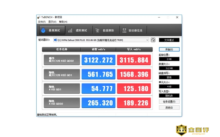 接下来,小编使用专业的硬盘测试软件,对这款硬盘进行测试,首先是固态硬盘测试软件TxBENCH,软件版本为0.95 Beta版。测试结果顺序读取速度为3122.27MB/s;写入速度为3115.88MB/s