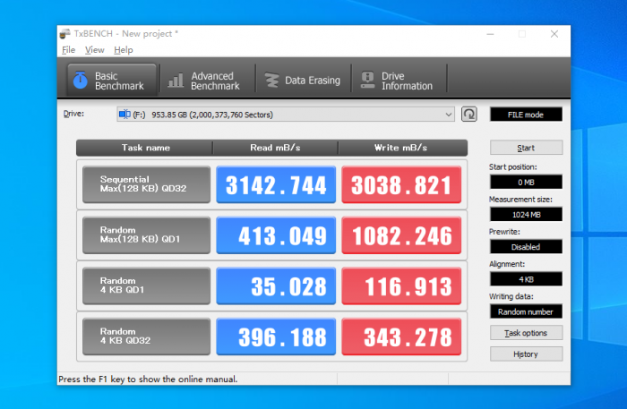TxBENCH是一款固态硬盘性能测试工具,也是最近国内外比较认可的一款SSD测试软件。经过实际测试,大华C900 PLUS固态硬盘的读取速度达到了3142MB/s左右,写入速度达到了3038MB/s左右。这个测试值和官方给出的数据非常接近。