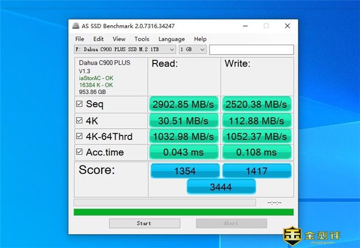 大华C900 PLUS固态硬盘的表现也非常优秀,读取速度为2902MB/S,写入速度为2520MB/S,4K随机读写速率和前面的测试结果基本相同。