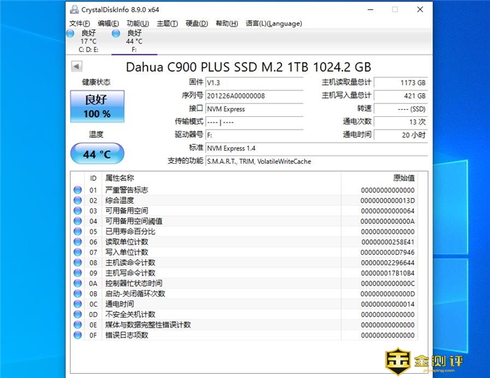 如上图所示,大华C900 PLUS固态硬盘传输协议为NVMExpress1.4,支持TRIM与VolatileWriteCache功能。总容量为1024.2GB,固件版本为V1.3,传输模式没有识别出来。然后我测试环境温度25℃,硬盘的默认运行温度温度44℃,温度比较低,完全不用担心这款固态硬盘的散热情况。