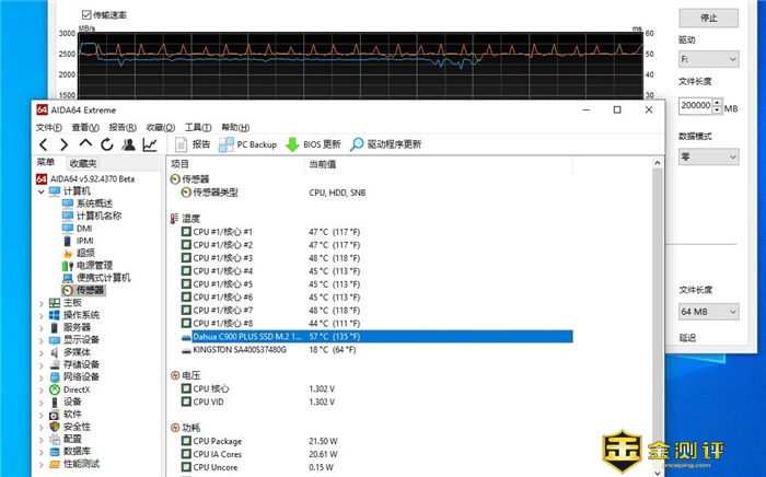 在使用HD Tune测试时,我使用AIDA64监测了大华C900 PLUS的实时温度,整个测试环节最高温度维持57℃上下,在散热马甲的加持下,大华C900 PLUS温度确实控制的很不错。