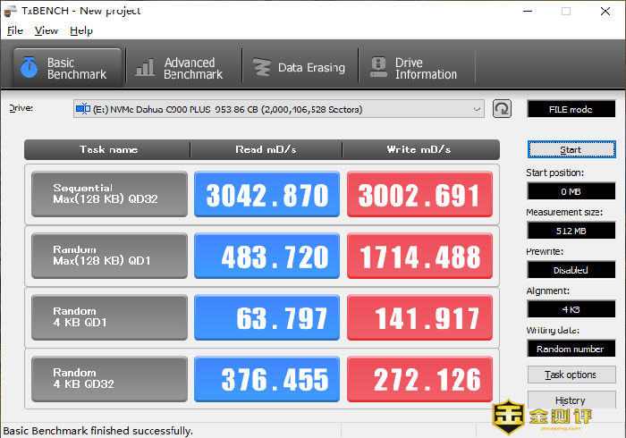 而在另外一款国外的测试软件TxBench的测试中,大华C900 PLUS最大连续读取速度为3042.87MB/s,最大写入速度为3002.691MB/s。