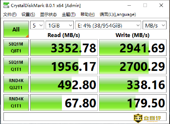 装机过程就不再赘述了,网上有很多教程,大家可以自行搜索。硬盘的性能究竟如何,我们还需要通过专业的软件进行测试。首先我们使用的是CrystalDiskMark对其进行测试,这款软件包括了连续读写、512K和4K数据包随机读写等性能测试。在这项测试种,大华C900 PLUS的连续读取速度为3352.78MB/s,和标称的3400MB/s相差无几,最大连续写入速度为2941.69MB/s。