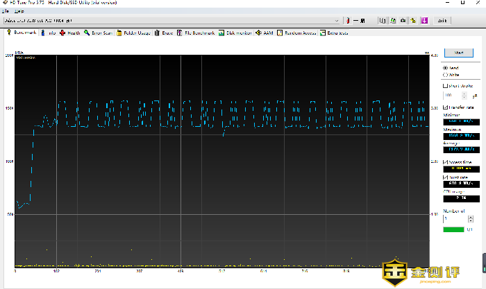 除了读写速度外,另一个关乎硬盘性能的关键因素是稳定性。这时我们需要使用HD Tune这款软件对这项性能进行测试,我们将连续写入的数值设置为100GB,观察其在写入数据量过程中的稳定性。经过测试可以看到,大华C900 PLUS的最大写入速度为1569.9MB/s,最小写入速度为550.1MB/s,平均速度则保持在1379.9MB/s。而通过数据读取的曲线我们可以明显看到,读取速度在102gB以后便稳定在1500MB/s上下,性能相当稳定。