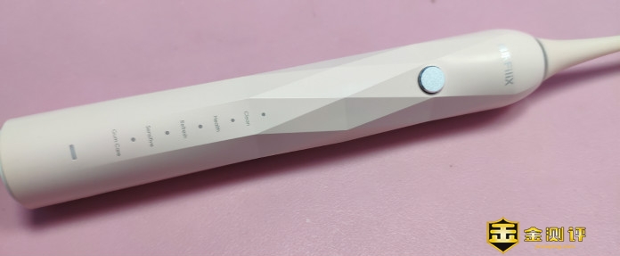 主机持握处是钻石切割的,不仅能增加持握时的摩擦力,即使湿了也不会打滑,而且不同角度会呈现不同的光泽。主机上部是扉乐Filix的字样,中间靠上是一个控制按钮,可以实现开机、切换模式和关机。主机中下部是五种模式:洁齿、健康、漱口模式、敏感模式以及牙龈护理模式。