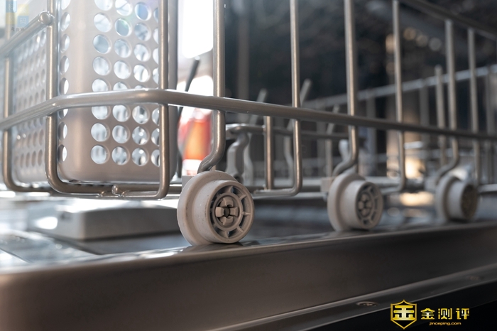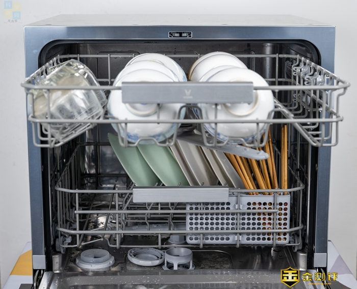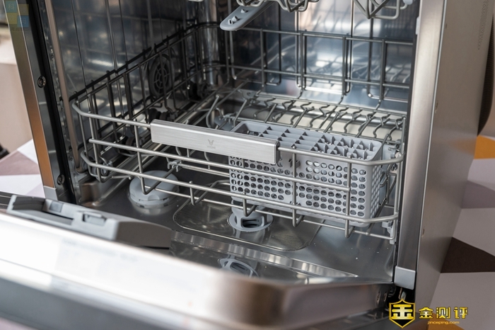 打开洗碗机的外门之后,可以看到里面有两层碗篮,其中上层主要用来放置碗碟和马克杯,下层主要用来放置盘子和筷子,两层都有比较稳固的设计,同时通过滑轮向外拉出,平时使用会很方便。另外值得一提的是,这款洗碗机可以准确识别外门的开合状态,打开之后屏幕上会显示OPEn,同时停止执行洗涤作业,比较的安全。