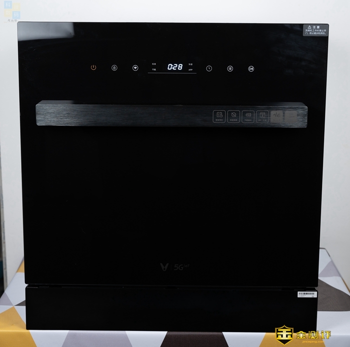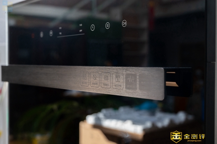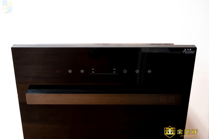这款洗碗机的正面除了有用来操作的按键之外,还有一些特色功能的图标,但是看起来很低调,放在了金属握把的右侧,并不那么显眼,日常使用的时候可能都不会注意到。从上面我们可以看到这款洗碗机特色包括智能预约、抑菌保鲜、节能省水、脉冲洗涤,以及高温烘干等,都是比较实用的特性。
