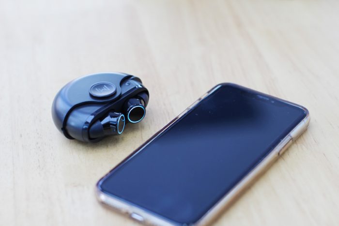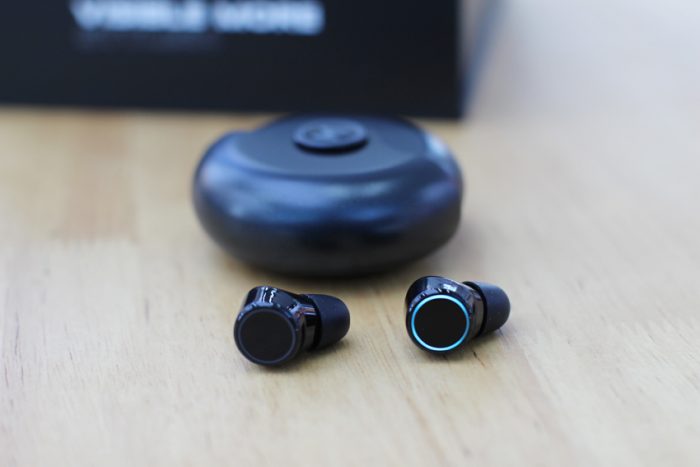 耳机的外形圆润可爱,外侧一圈蓝色的指示灯非常漂亮。