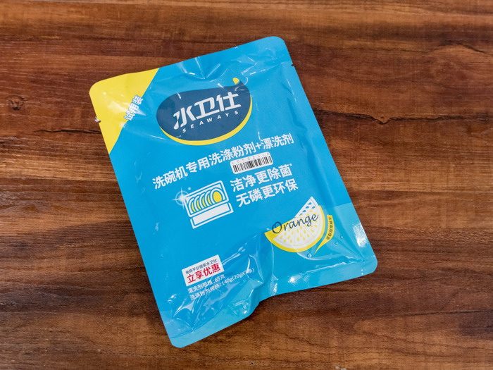 配件里除了安装配件以外,还送了一包洗碗机专用洗涤粉剂+漂洗剂的试用装,非常贴心。