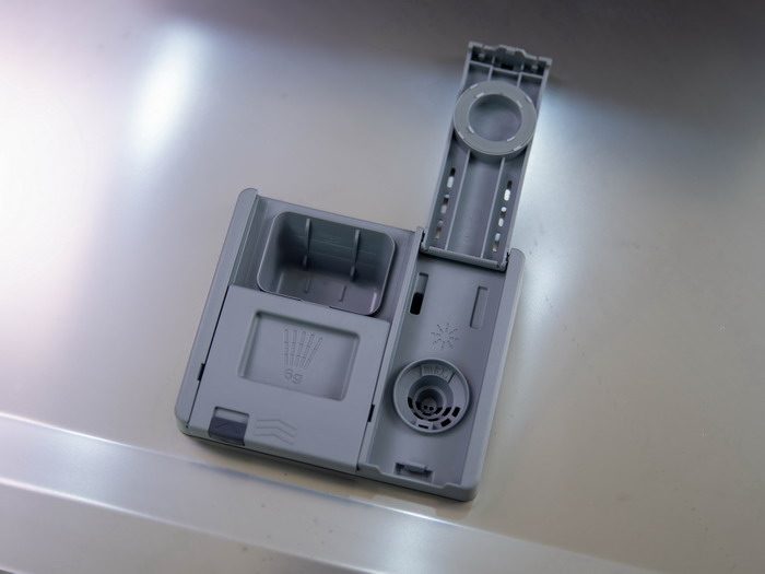 拉开云米互联网洗碗机Iron X1的门,需要用一点力气,门还是吸得很紧的,可以看到门的内侧是不锈钢材质的,这里设计有一个分配器,分配器是用来添加洗碗粉和漂洗剂的,这样清洁效力才会更强劲,烘干也更容易。