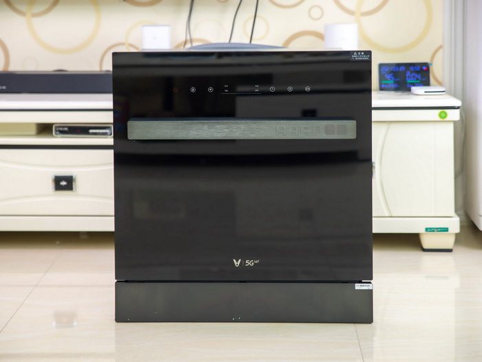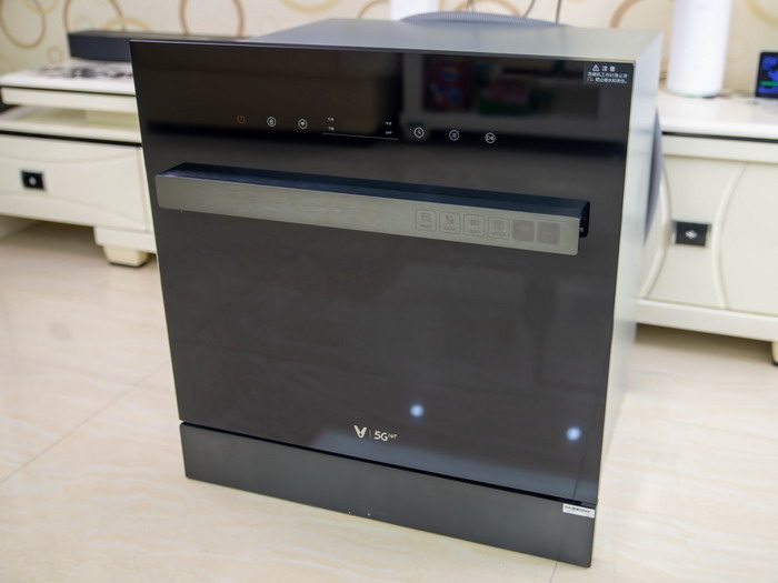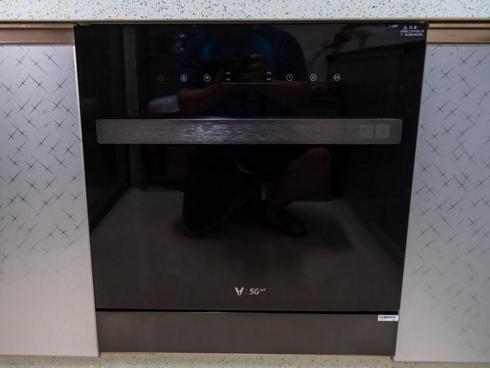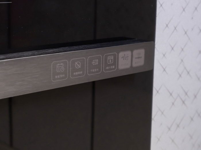 云米互联网洗碗机Iron X1的正面采用了黑色玻璃面板搭配铝合金拉手,从质感方面来看,非常具有艺术感,这一整面的黑色玻璃面板,完全可以当做镜子来用了,晶莹剔透。