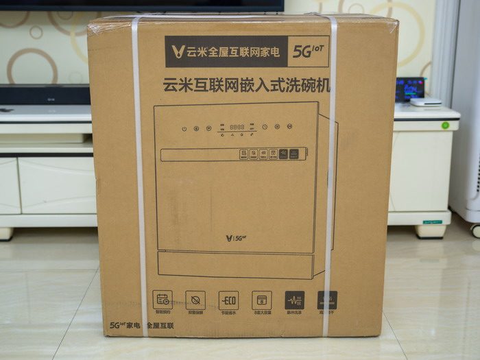 云米互联网洗碗机Iron X1的包装箱的保护性非常好,外面是一层厚厚的瓦楞纸箱,内部还有全方位包裹的泡沫,并且机器内的所有部件都有固定保护,所以就算碰到暴力的快递,基本也不会有任何问题。包装箱的正面印有产品的外形图,下面介绍了产品的功能特点。