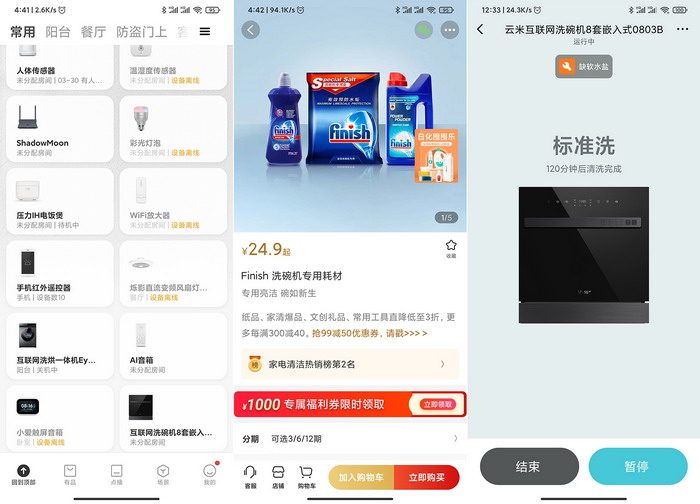 因为一开始用的是云米商城APP,后来我想起来这款也是加入了米家的,所以可以统一管理,果然在米家APP里已经有了在这款洗碗机,并且在APP里,还可以直接购入洗碗机专用耗材,试用装可用不了多久,这个是必须要入手的。由于试用装只有洗涤粉剂和漂洗剂,所以机身面板和APP都会提示缺少软水盐。