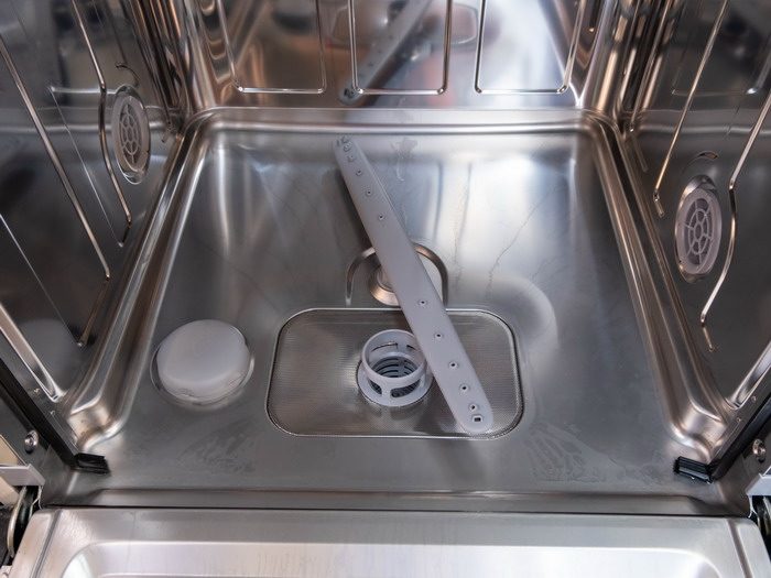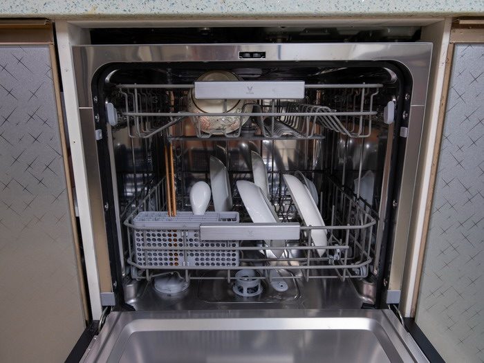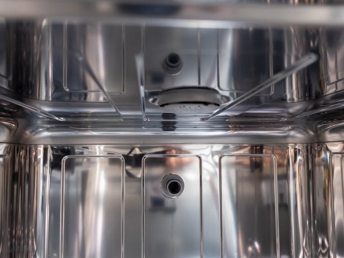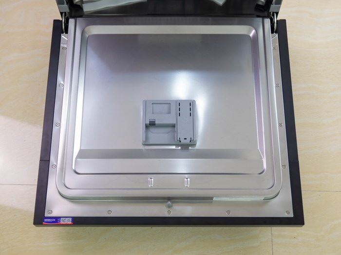云米互联网洗碗机Iron X1的内部都是不锈钢材质,做工非常不错。内部下方左侧是软水器,中间是过滤组件,所以有食物残渣在餐具了,也会被这里阻拦起来。