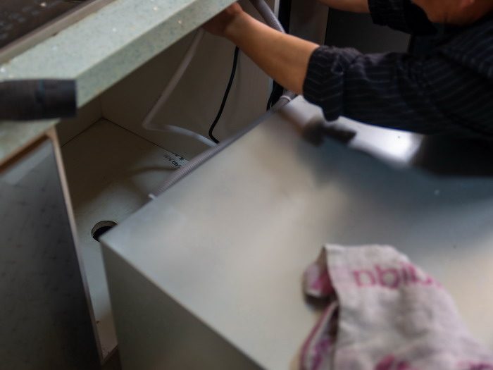 通过包装箱上的二维码预约了安装师傅上门,由于安装位置尺寸合适,原先的开口可以穿水管,供电的排插原来就有,基本不用变动什么,所以整体的安装非常简单,没有碰到阻碍,半个多小时就完成了安装。一般来说,只要安装位置有560*605*520mm,就可以装入,但是面板尺寸会大一些,完整尺寸是595*627*520mm,这两方面都满足的话,最多就开个孔穿水管,如果位置不合适,那就要改造或换地方了。