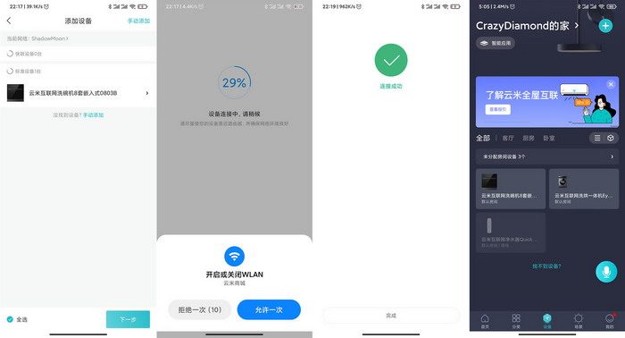 这时候在APP上,就自动搜索到了云米互联网洗碗机Iron X1,输入2.4G频段WIFI的账号和密码,就可以轻松连接,然后再APP上就可以看到云米互联网洗碗机Iron X1了。