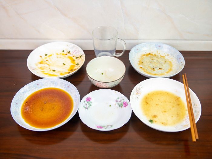 艰难的吃完了,果然还是多了一些,可以看到,左上角的油污最重,右上角的次之,其他三个还好,饭碗肯定会有残留的饭粒,一般洗饭碗我都要稍微浸泡下才好清洗,直接洗要怼很久才能洗干净。接下来,就准备试试云米互联网洗碗机Iron X1的效果了。