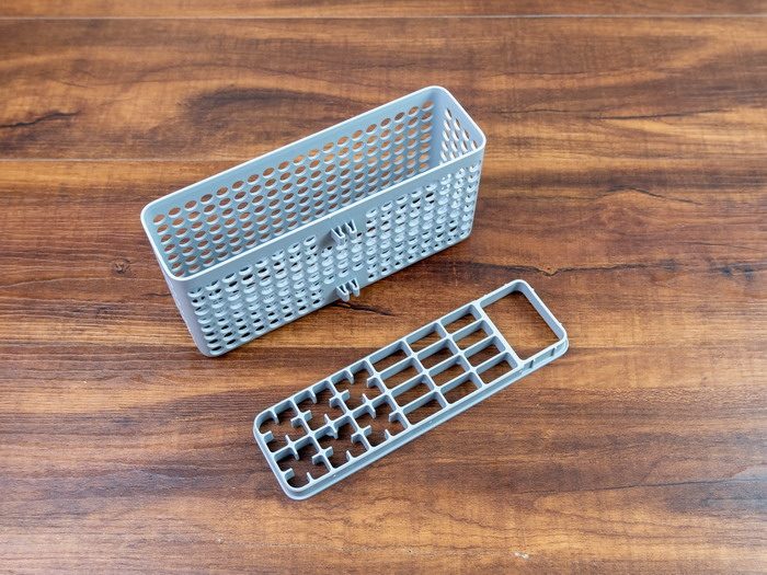 随机还有一个筷篮,可以固定在下碗篮的框架上,这个筷篮分成三个区域,左边十字开孔的是放筷子的,中间一格一格的是放勺子,刀叉的,右边大长方形是用来放饭勺的。