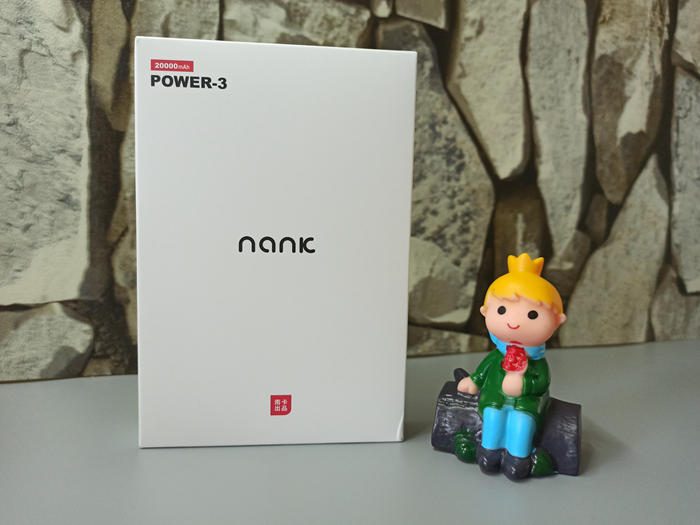 白色的长方形包装盒,中间是NANK的专属logo,左上角是充电宝的型号POWER-3,红色突出20000mAh。