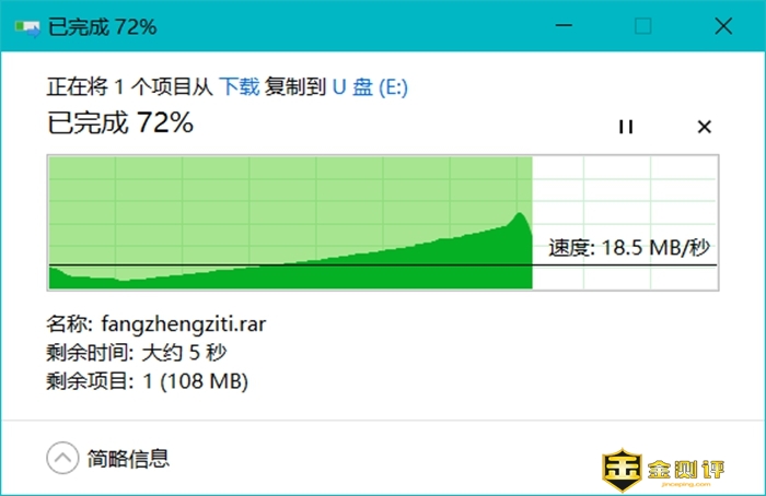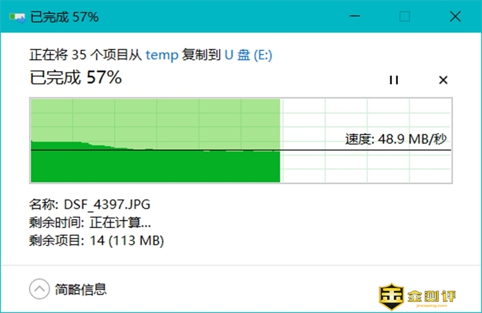 综上,大华P609这款U盘在软件测速上的结果还算不错,下面在来看看它实际的文件读写表现。在复制一些小文件的时候,这款U盘的写入速度可以达到50MB/s左右,而在复制单一大文件的时候,大华P609的速度则是20MB/s左右的一个范围。