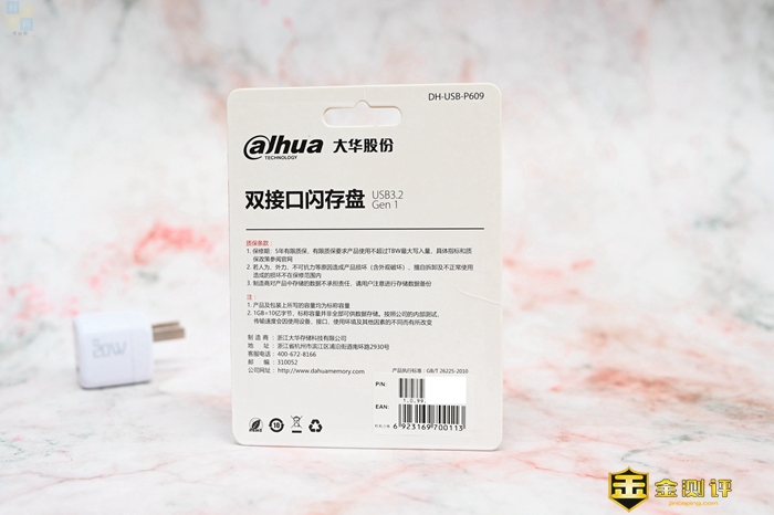 这款U盘的包装比较标准,上面简单介绍了大华P609的一些特性,包括支持USB-A 3.2 Gen 2以及USB-C双接口,另外还有5年质保。因为现在的很多设备都有USB-C接口,所以这种双接口的U盘比单接口的版本更实用一些,手机上也可以即插即用。