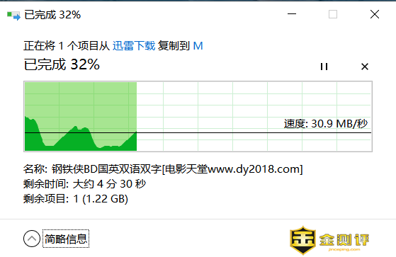 我们使用电脑将一部大小为1.8GB的电影传输到U盘,其传输速度也可以稳定在30MB/s左右,速度相当快。