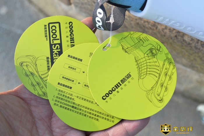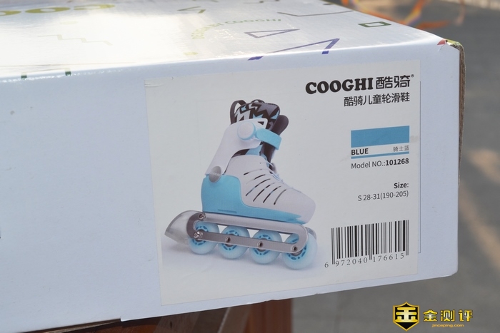 提手的位置有一个款式名牌。酷骑儿童轮滑鞋主要是对应的4-7岁,脚长19-20.5cm的小朋友最适合入手,不过只要合脚应该都能上手。