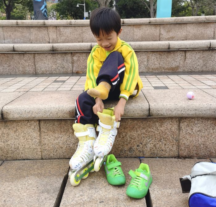 一拿到快递儿子就迫不及待要去附近公园试玩,不过我也早料到如此,所以让他把护具与头盔都穿戴好,带上轮滑鞋出发公园。