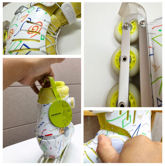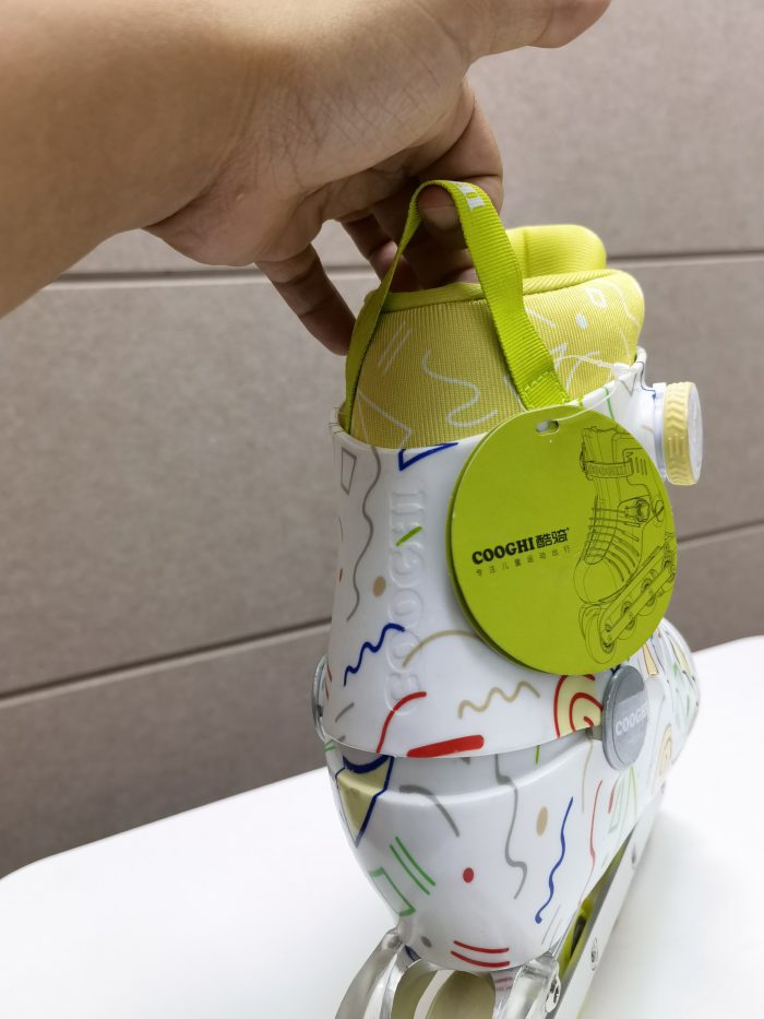 酷骑在儿童产品的包装上,就能感受它的专业与用心,轮滑鞋为两层包装,一层是定制的快递外包装,显示的LOGO+轮滑鞋的素描图,让人一目了然,拉出内层才是产品独立包装,精品礼盒非常高大上,色彩鲜艳、图案新颖一眼就获得小朋友的喜欢,我选择的是几何白,颜色醒目,一眼看出就是正面或背面那一幅偌大的COOGHI酷骑“勇敢竞技家”系列儿童轮滑鞋的产品渲染大图,让人自然心中期待里面的内容。侧面主要是一些产品卖点或厂商的信息,还有一些注意事项。