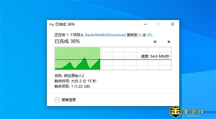 具体以传输一部电影的速度来看,大概1.22GB大小的电影内容,从电脑移至U盘中,传输速度差不多54.6MB/s,整个过程也就两三分钟就完成了,这个速度还是比较高效快捷的,基本不用等太久。