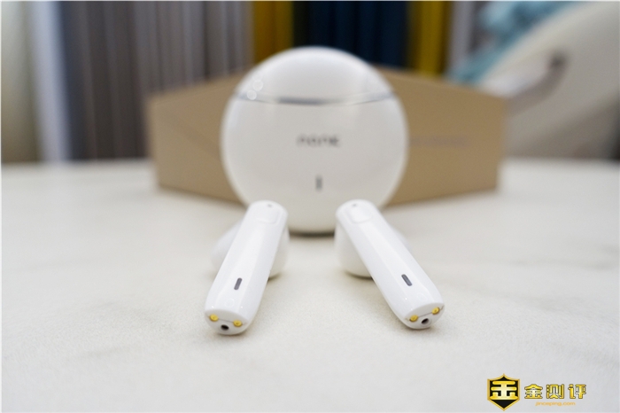 当我们打开充电盒后,可以看到耳机是放在充电盒内的,耳机的充电方式采用的是磁吸式的充电,放入即可以进行充电,并且充电盒内也设计了磁吸触点,充电上非常的方便。