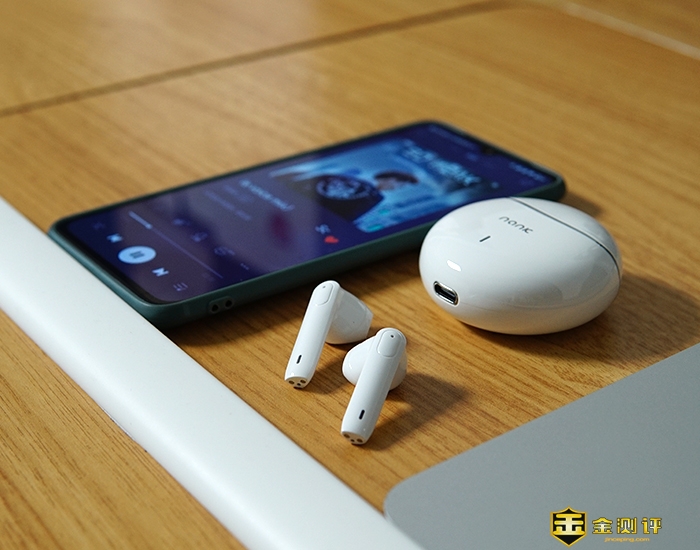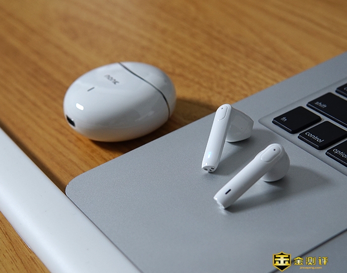耳机采用半入耳的设计,底部有个长长的尾巴,乍一看还有点AirPods的影子。耳机支持触控操作,耳机的顶端外侧即是它的触控区域,通过单击、双击、长按等操作,可完成切歌、调节音量、激活语音助手等指令,耳机的触控操作响应快速且准确。